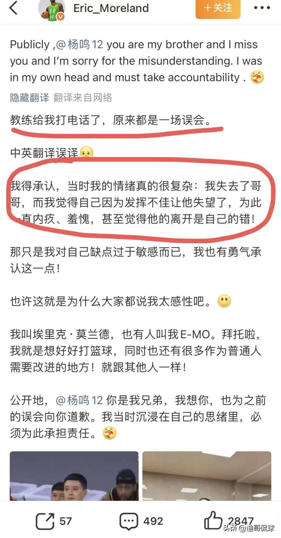 莫兰德和杨鸣肃穆和好,辽宁球迷看到这一幕皆备欢腾。一天前莫兰德在微博公开回怼杨鸣,因为杨鸣在讲解辽宁队的比赛时,说了莫兰德相比情绪化还有一些打球的过错,这让莫兰德不悦。于是莫兰德长文回怼,觉得杨鸣才是情绪化的教师,辽宁在乌戈指导下越来越好之类的话。本日莫兰德更新社媒,称杨鸣给我方打了电话,向我方谈歉了,事情也阐发晰了,这是一场歪曲!(文末附图)